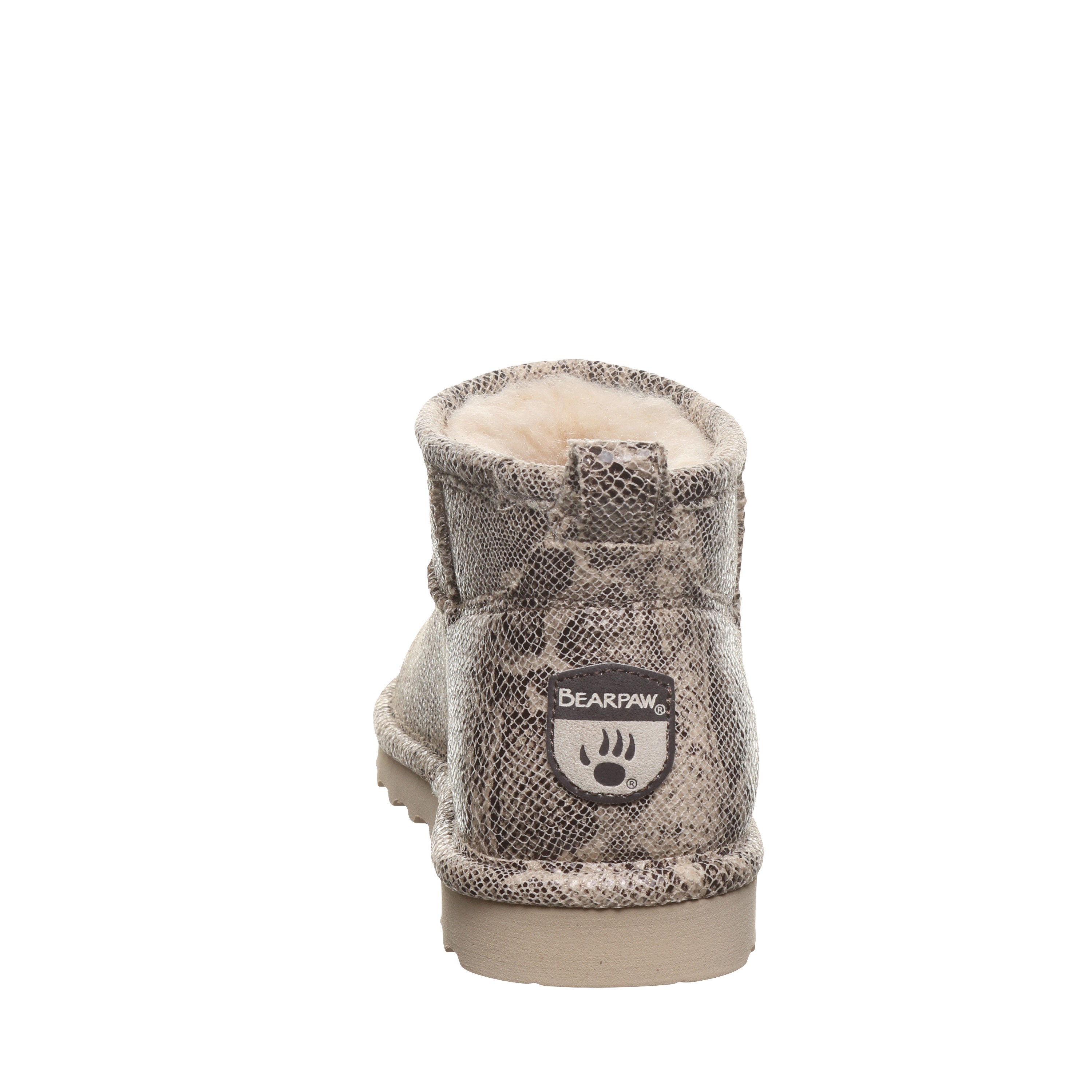 Bearpaw Shorty Exotic Women's Ankle Boots - 2861w. No need to compromise between style and comfort this winter. The Bearpaw SHORTY EXOTIC Women's Boots - 2861W are here to provide you with both. These short ankle boots are designed to keep you warm and dry during the cold, foggy, rainy, and slushy snowy days, all thanks to the BearCoat Rain & Stain Repellent. Not only are these boots practical, but they're also trendy, making them a win-win choice for the season.