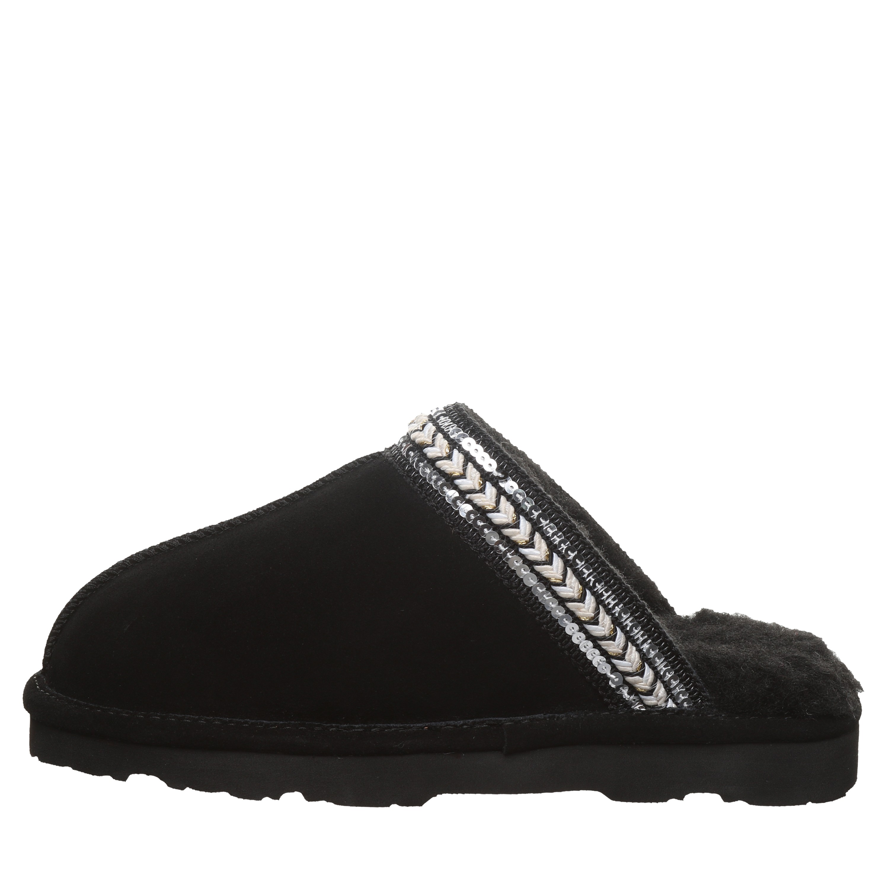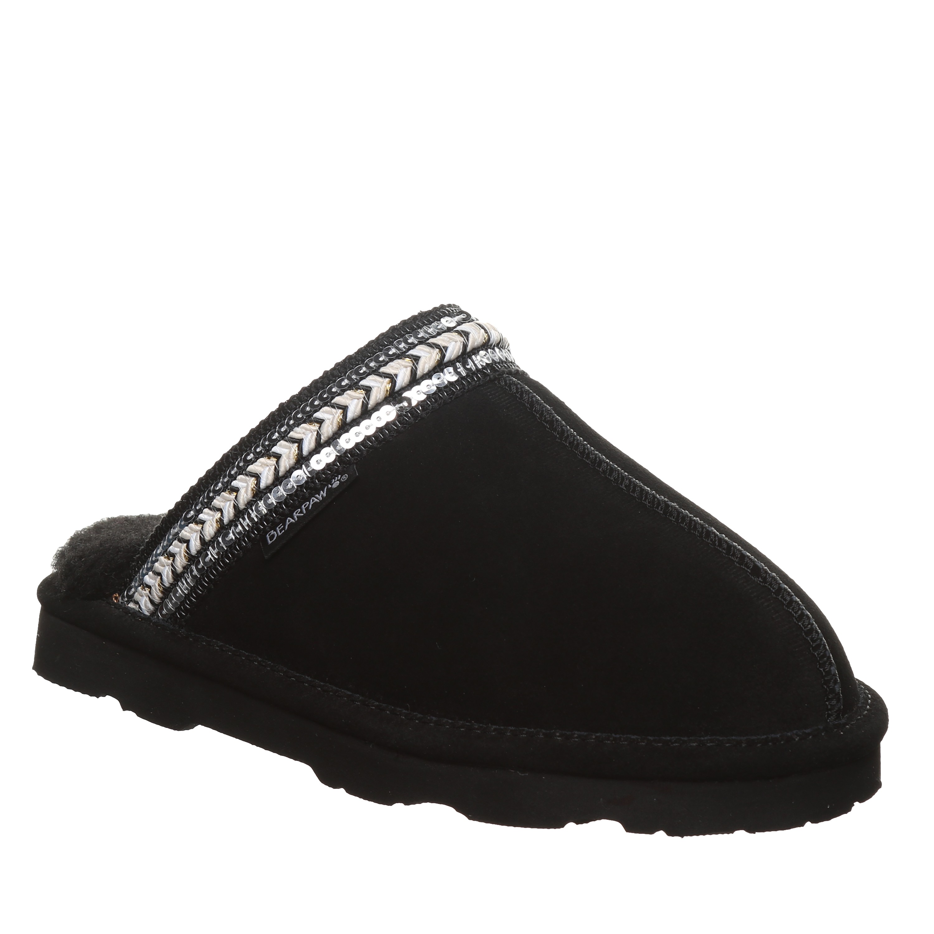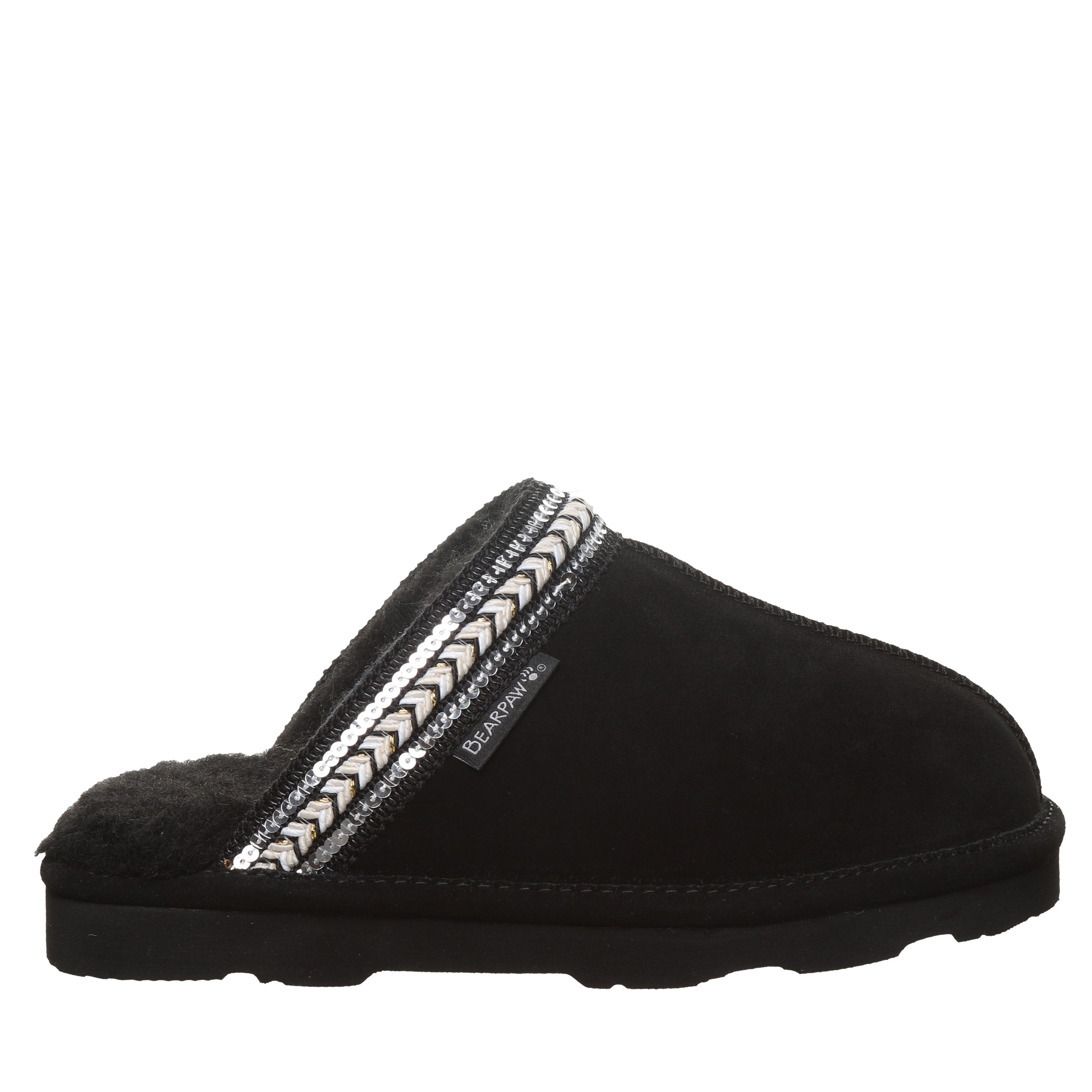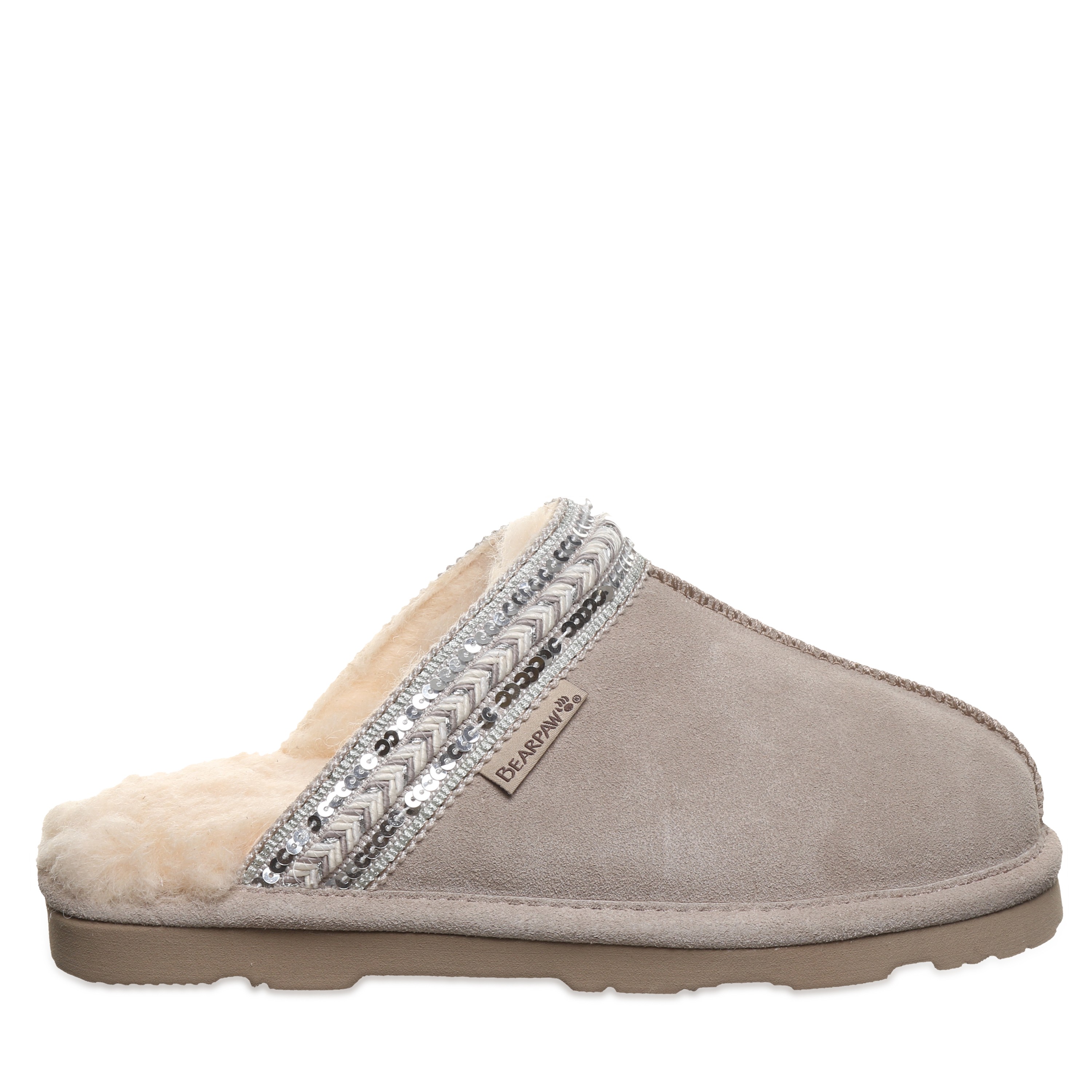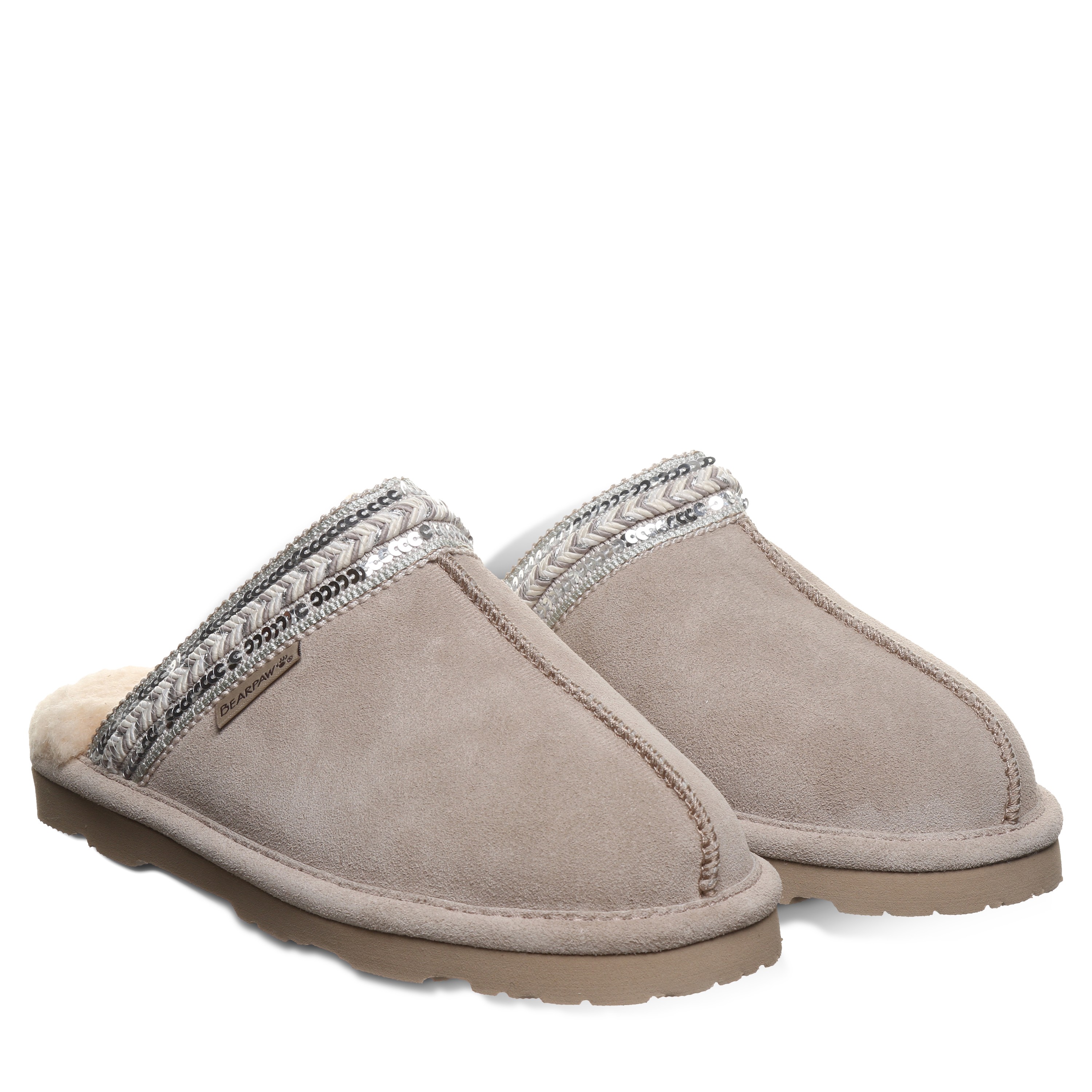 Bearpaw Tanya Women's Slippers - 3222w | Cozy Comfort Slip-on House Shoes. Experience graceful coziness and elegant chic style with the Bearpaw Tanya slippers, perfectly blending supreme comfort and subtle sparkle for footwear that feels as wonderful as it appears. Made from luxurious soft suede and featuring a plush wool blend lining, these slippers are adorned with delicate sequin braided details to enhance your daily lounging. Enjoy effortless slip-on convenience and a supportive cushioned footbed, delivering instant cozy comfort with every step.