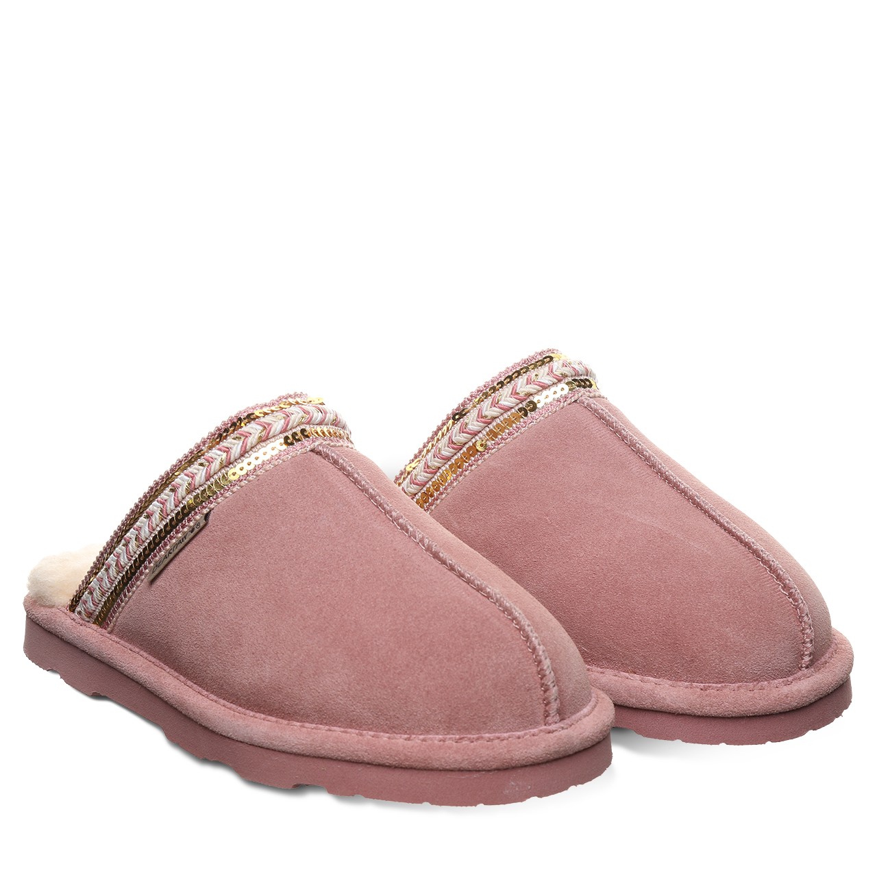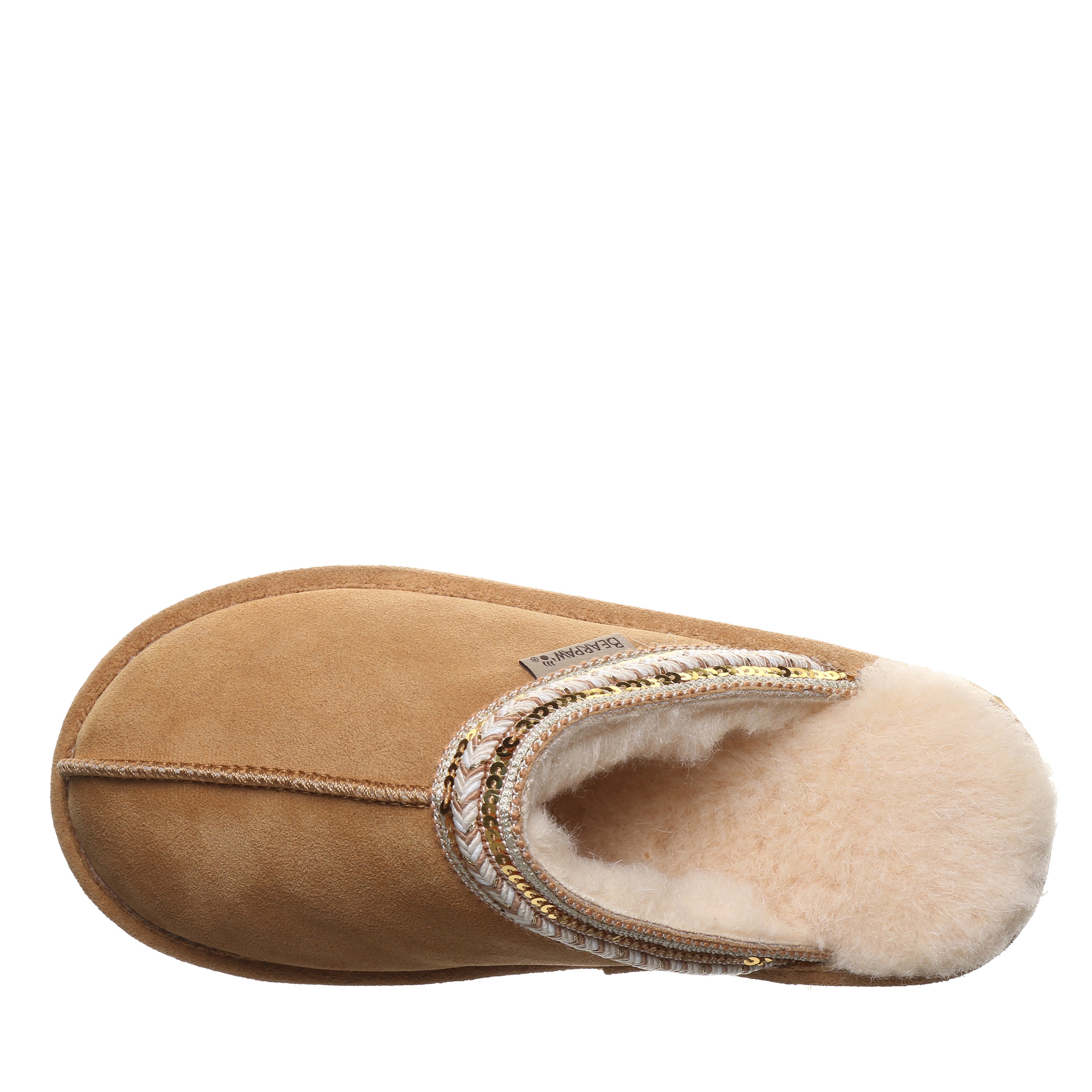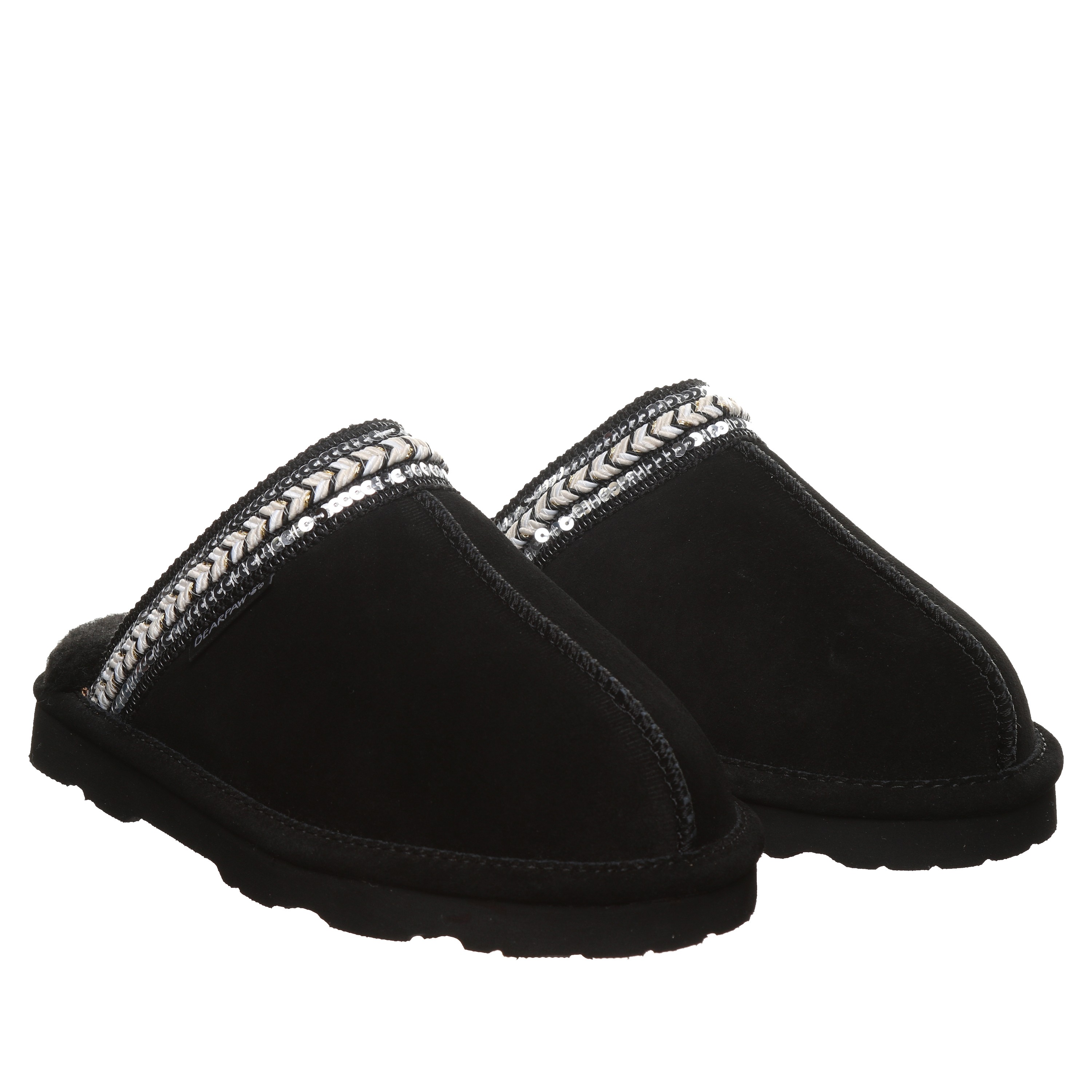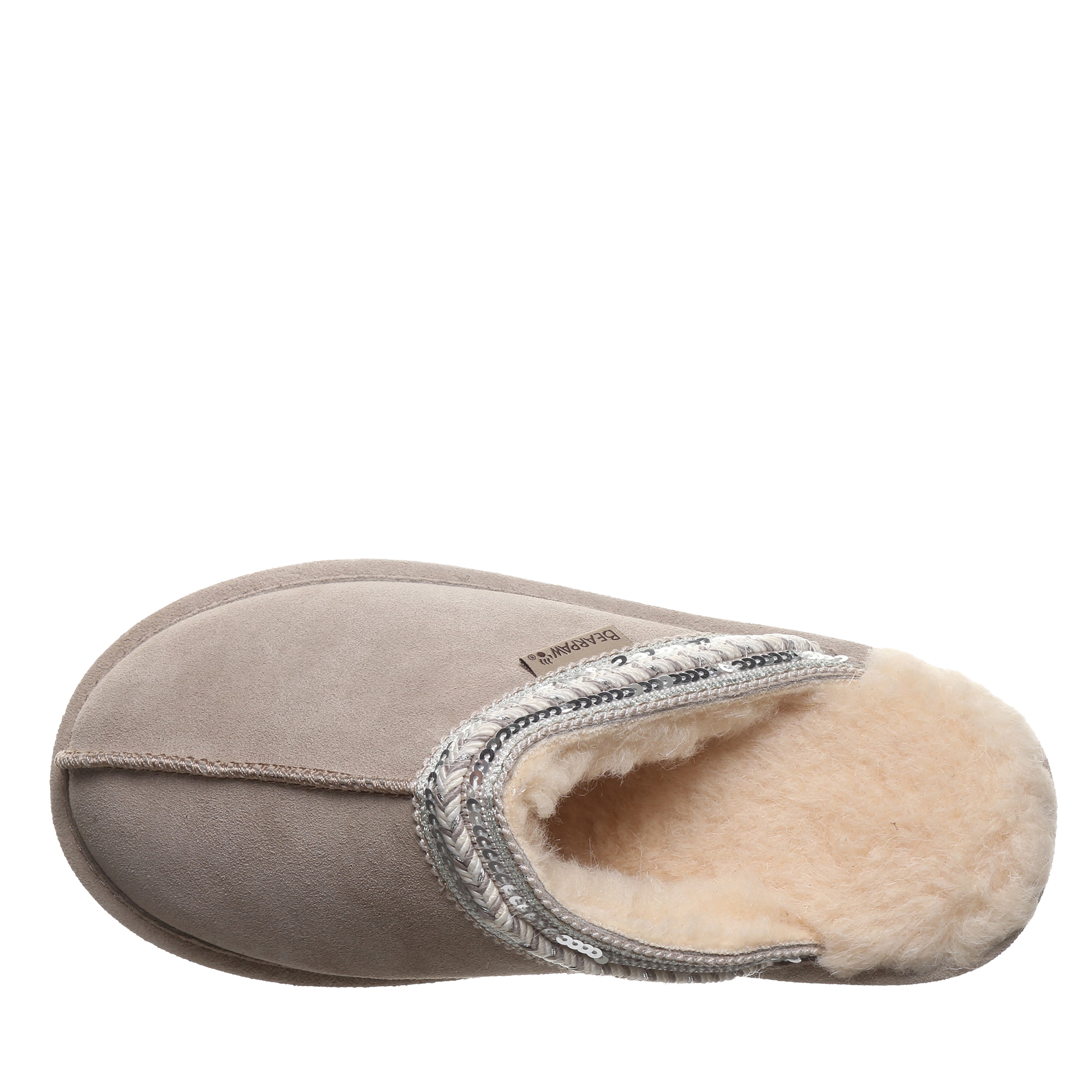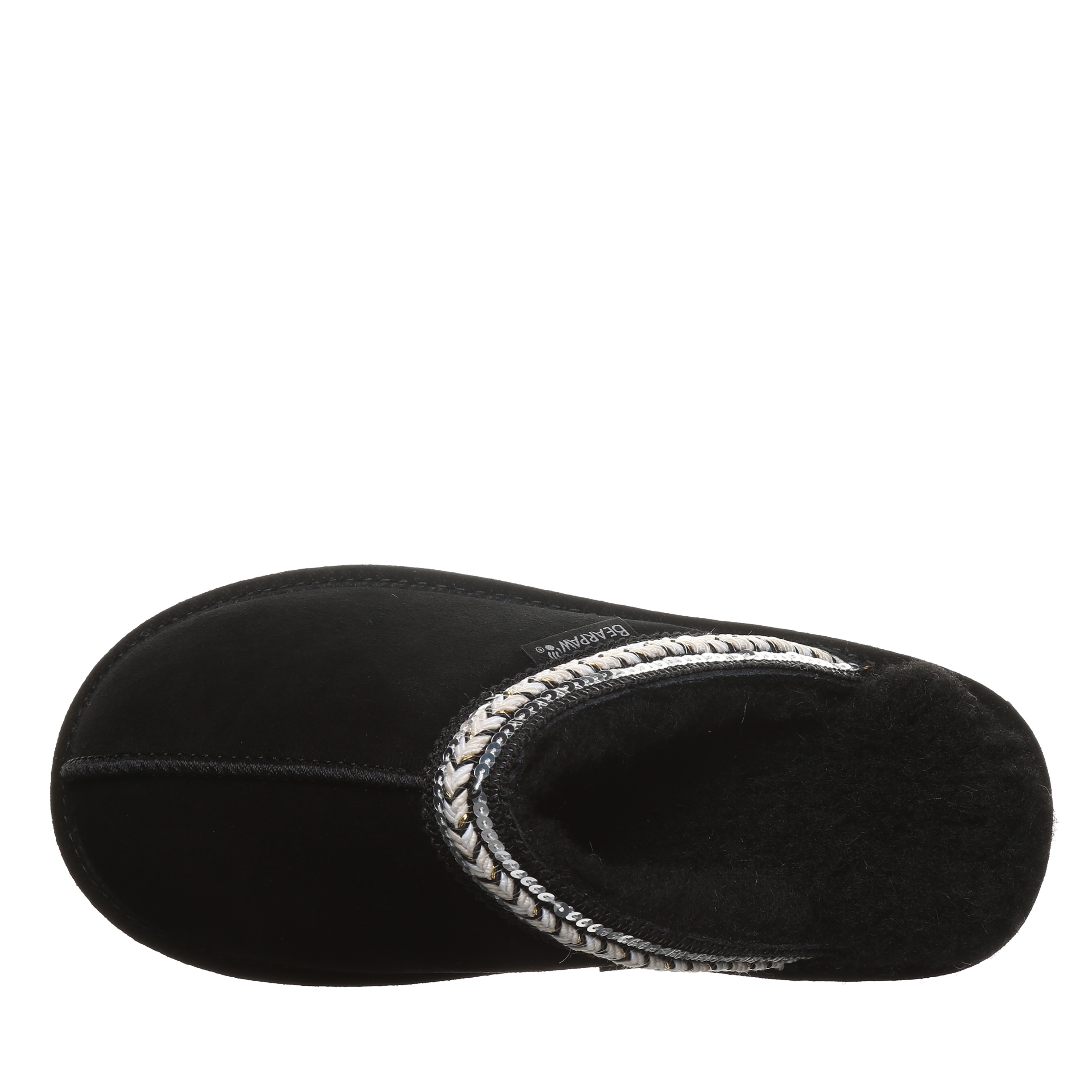 Bearpaw Tanya Women's Slippers - 3222w | Cozy Comfort Slip-on House Shoes. Experience graceful coziness and elegant chic style with the Bearpaw Tanya slippers, perfectly blending supreme comfort and subtle sparkle for footwear that feels as wonderful as it appears. Made from luxurious soft suede and featuring a plush wool blend lining, these slippers are adorned with delicate sequin braided details to enhance your daily lounging. Enjoy effortless slip-on convenience and a supportive cushioned footbed, delivering instant cozy comfort with every step.