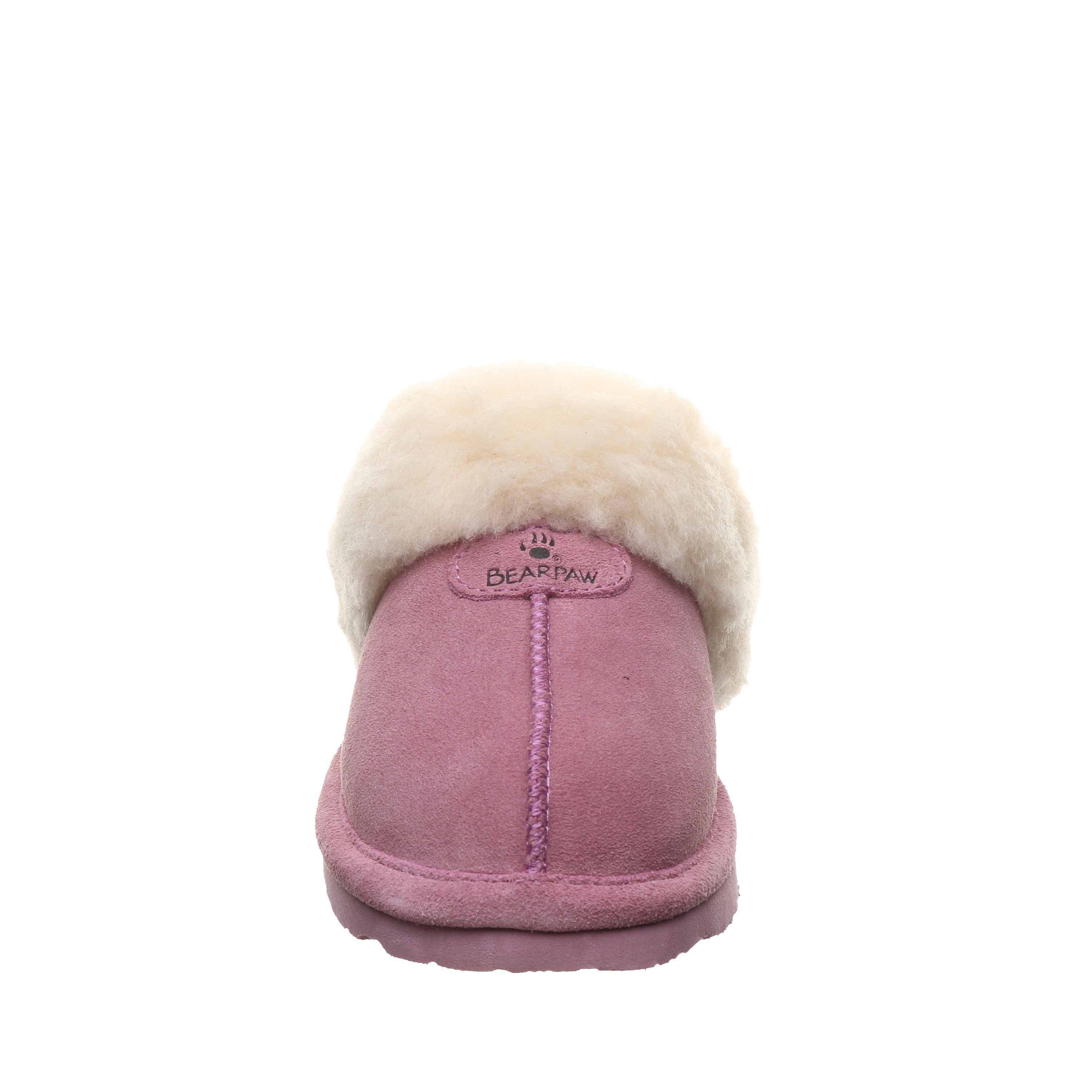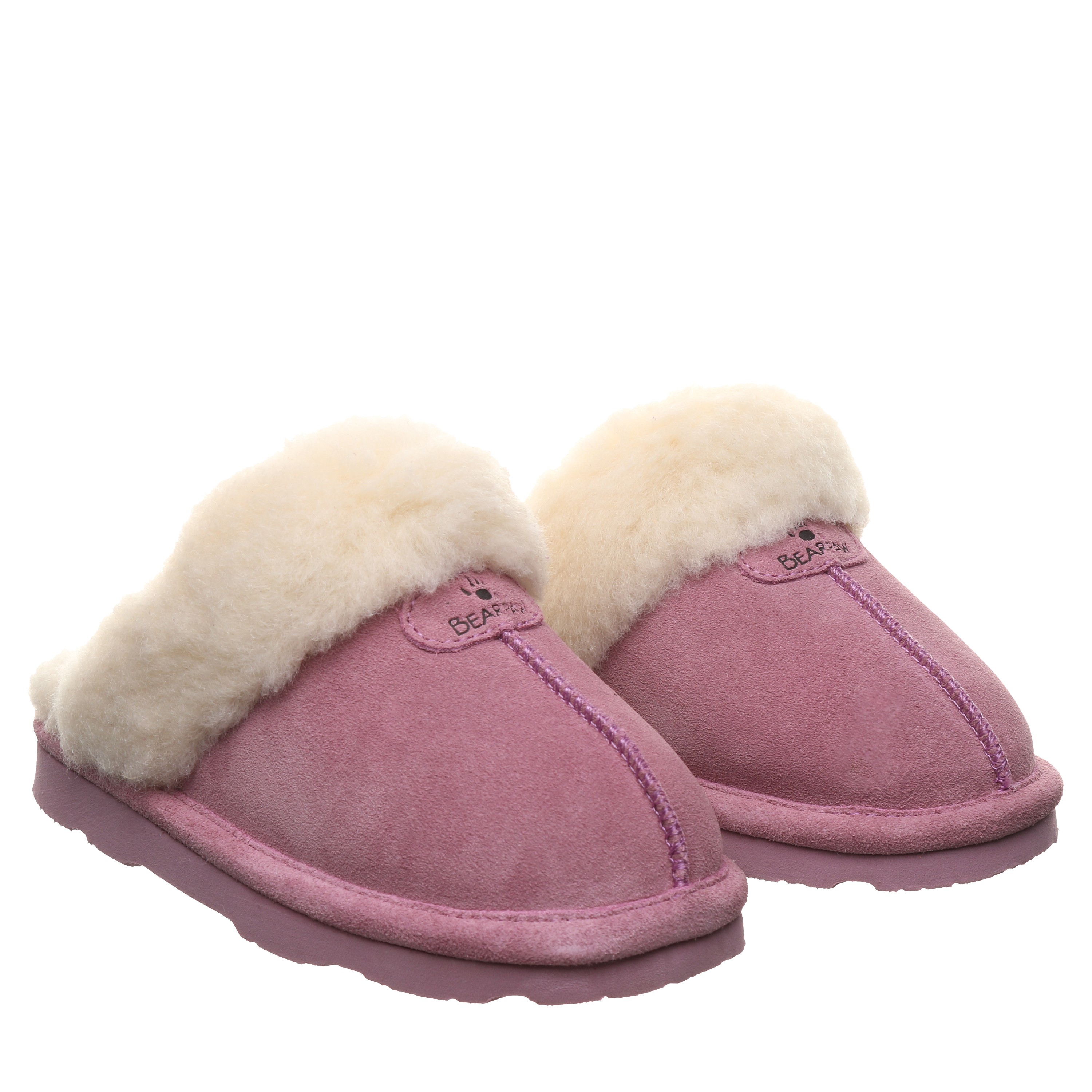 Bearpaw Loki Youth Youth's Indoor/outdoor Slippers - 671y. Start your day on a plush note with the Bearpaw LOKI YOUTH Youth's Slippers. These slippers are designed with soft suede uppers and a sheepskin collar that not only provide comfort but are also easy to maintain. With a sheepskin lining that regulates body temperature and a footbed that reduces foot fatigue, these slippers are perfect for both indoor and outdoor use.