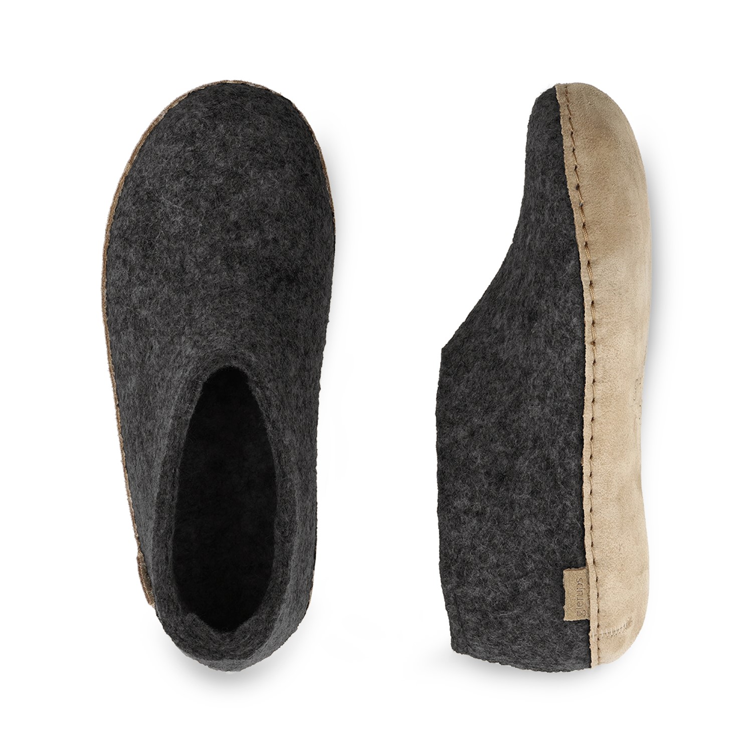 Glerups Wool Closed Heel Unisex Slipper Shoe - Leather Sole - Model A. Felt shoe of 100% pure natural wool with leather outsole. The shape of the shoe follows the contours of the foot, ensuring the shoe stays on. The closed heel slipper shoe is flexible, and it keeps the foot warm and dry, due to the characteristics of the wool, as it has a great capacity of absorbing moisture. The leather sole is quiet and perfect for indoor use. Model A. A