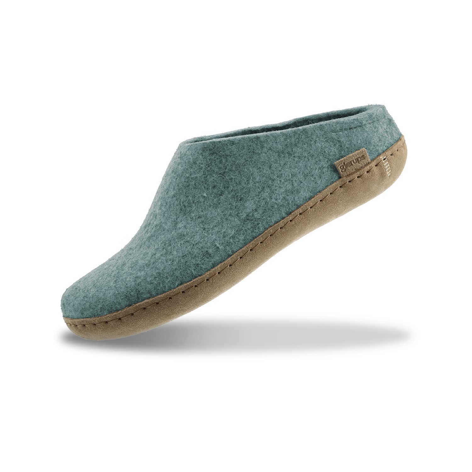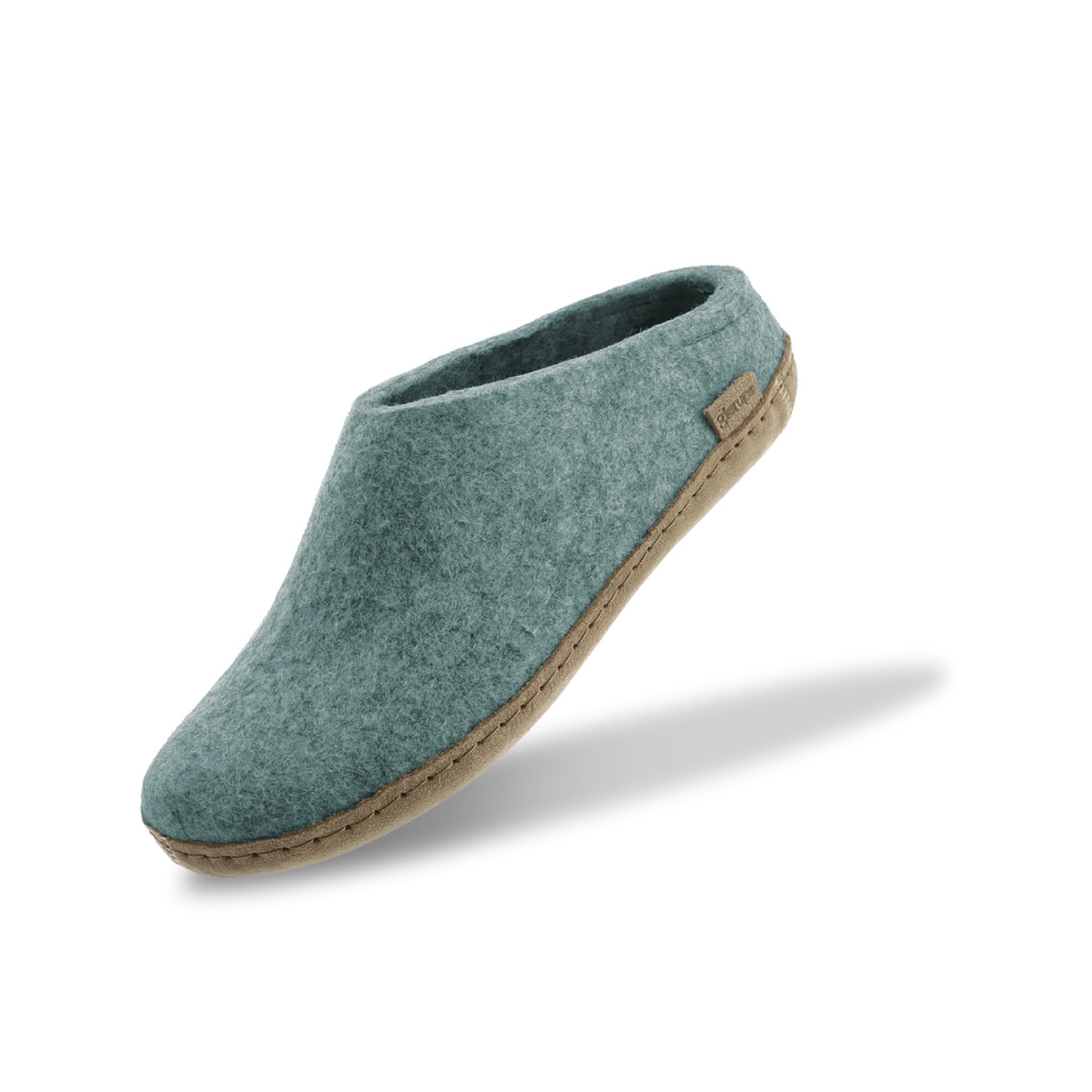 Glerups Wool Open Heel Unisex Slipper / Slip-on Clog - Leather Sole - Model B. Felt shoe of 100% pure natural wool with leather outsole. The shape of the shoe follows the contours of the foot, ensuring the shoe stays on. The slip-on open heel design of the Glerups Model B slipper allows easy on and easy off use. It keeps the foot warm and dry, due to the characteristics of the wool, as it has a great capacity of absorbing moisture. The leather sole is quiet and perfect for indoor use. Model B. B