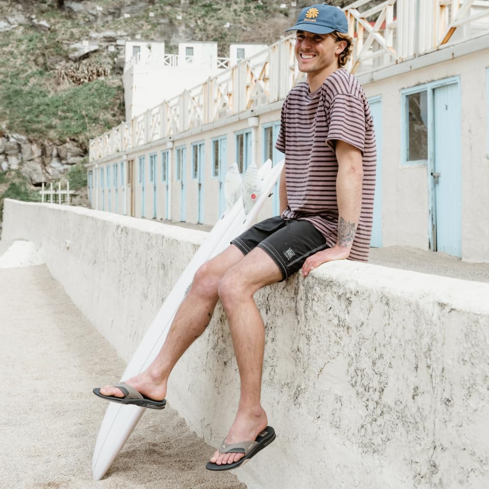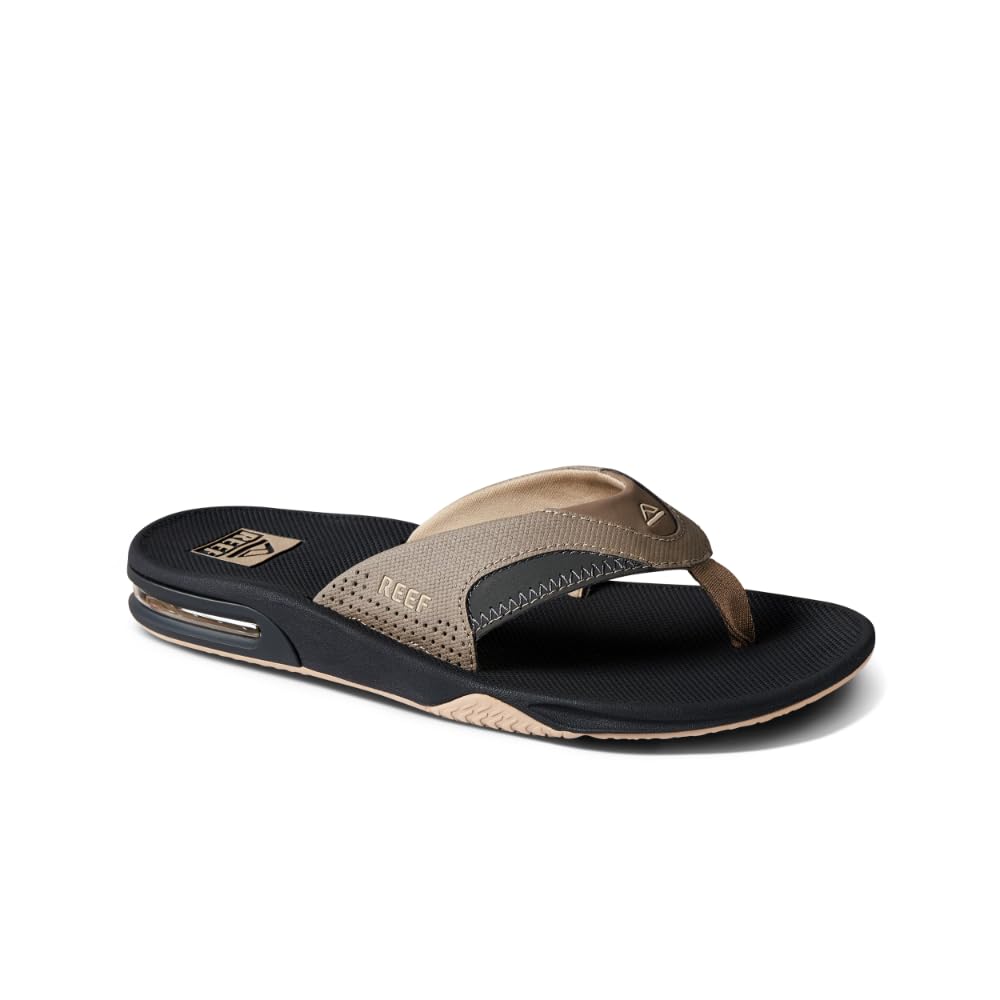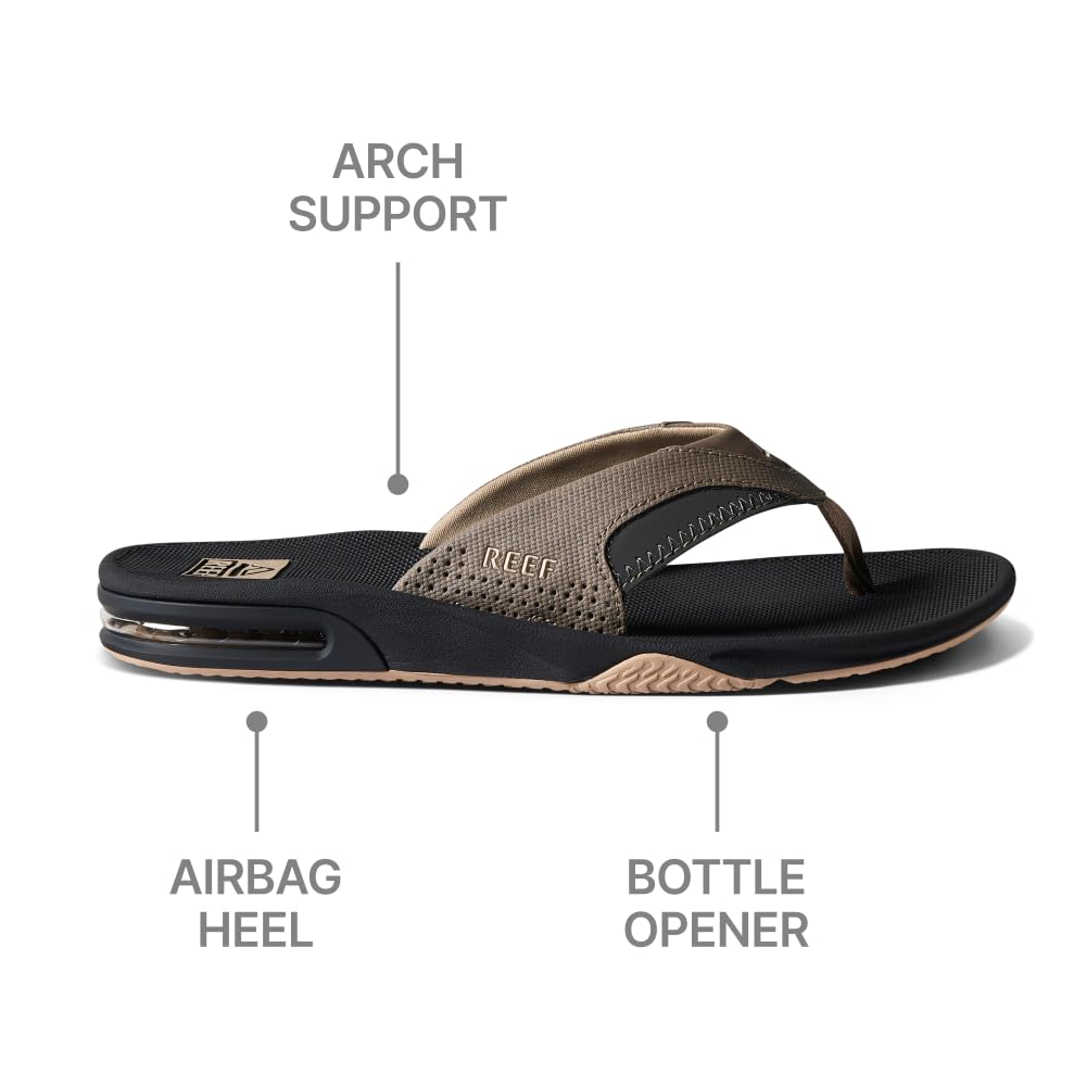 Reef Fanning Men's SandalsHow you become a legend: work- sweat- repeat. Surfing great Mick Fanning inspired this hard-working flip flop. With a synthetic nubuck upper- padded liner- compression molded footbed with a heel airbag- plus a rubber outsole with built-in bottle opener to celebrate success. Reef is surf. They're inspired by water- by the ocean- by perfect waves- and the journey along the way to find them. They are a genuine- global surf brand that harvests the best of the lifestyle and shares it through authentic- innovative and fashionable product. At the core of Reef is their Latin roots and the inherent sensuality of the beach. The Reef team is committed to having fun in and out of the water- as well as giving back to the world that inspires them. Features and Benefits of the Reef Fanning Men's Sandals