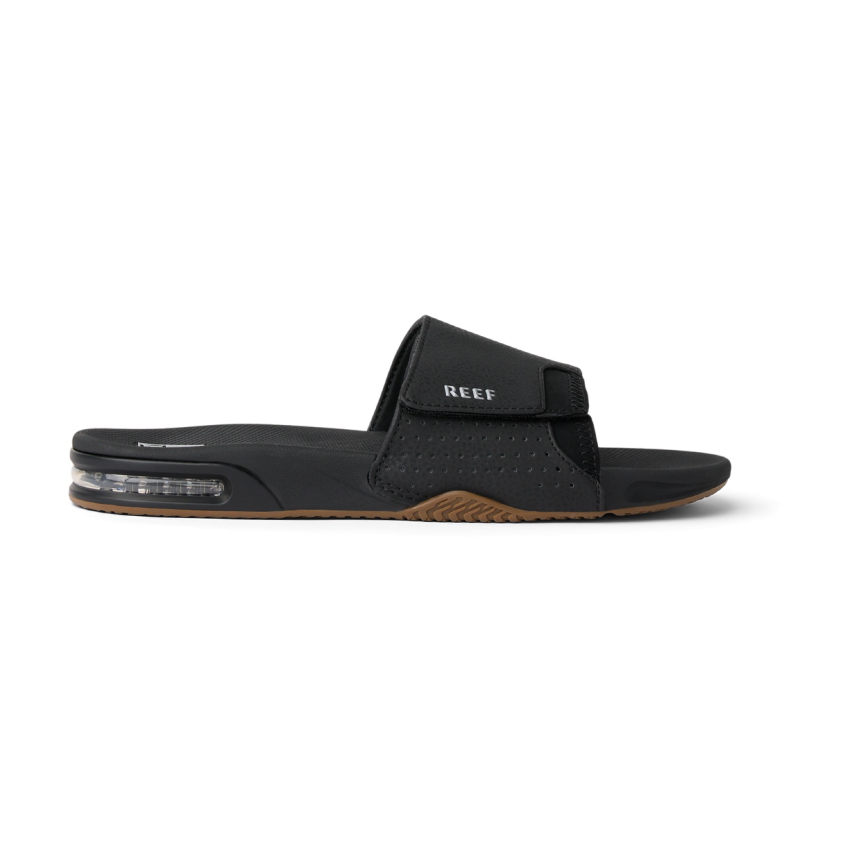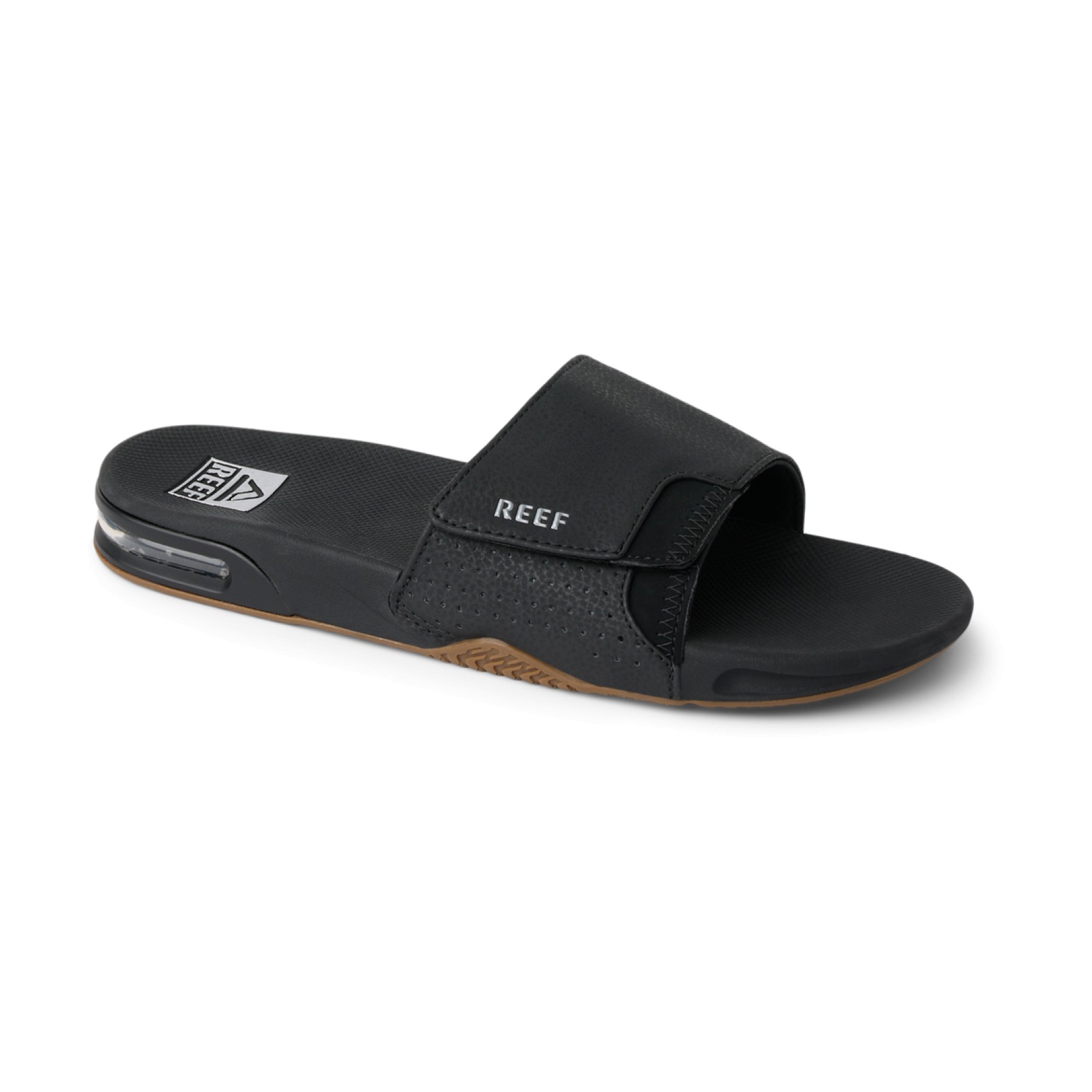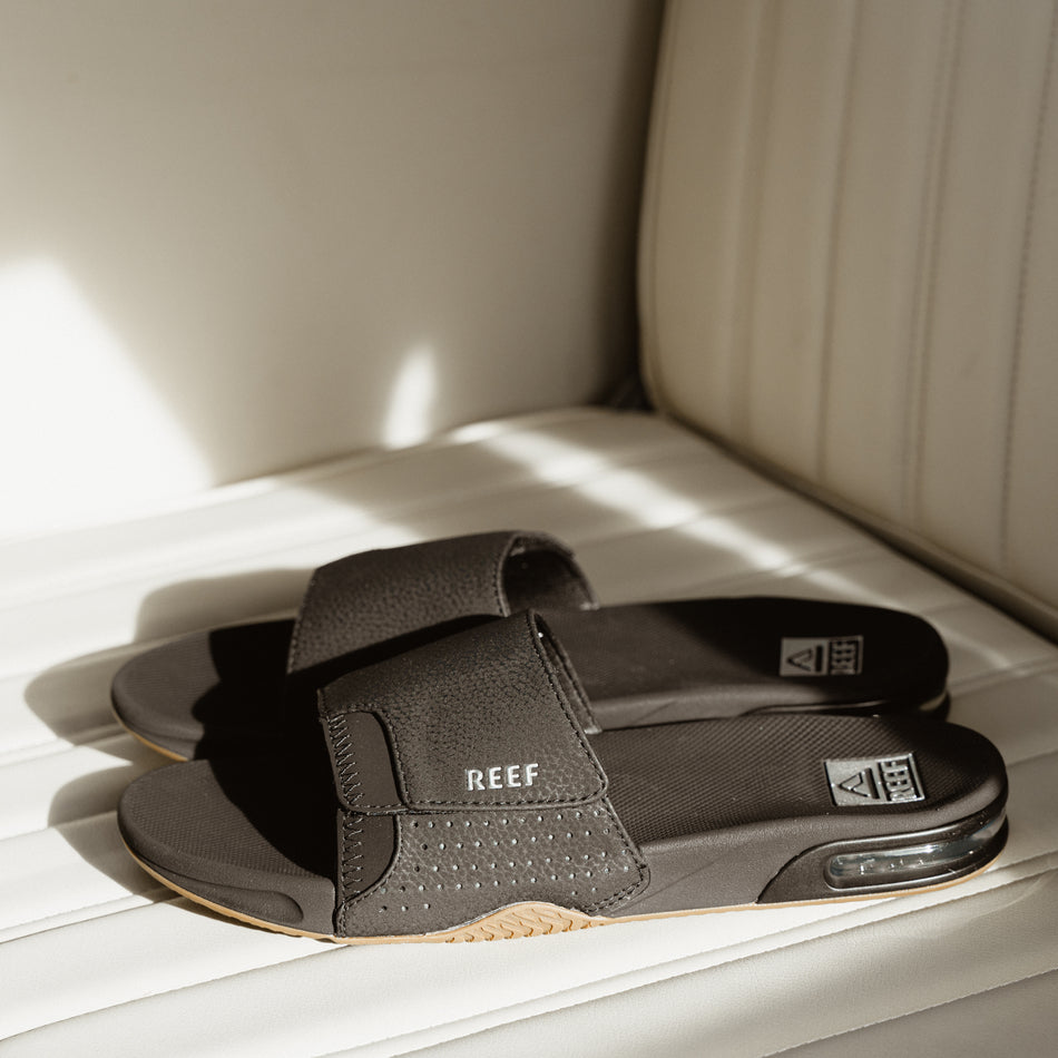 Reef Fanning Slide Men's Sandals. 100% Fanning. 100% slide. 100% Reef. The Fanning slide is 300% awesome. With everything that makes the Fanning our bestselling men's shoe, including the crucial built-in bottle opener. Now styled as an easy on, easy off, easy everything slide. 100% do it.. |Compression molded high rebound EVA with a built-in airbag under foot for added comfort. |Non-Marking Rubber Outsole with Bottle opener so that no party may go unquenched|. .