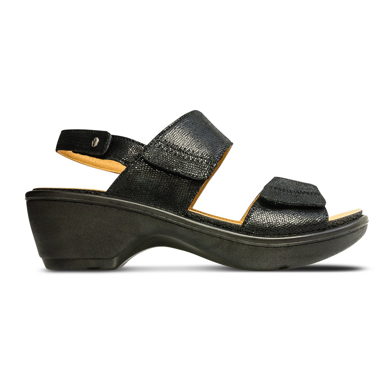 Revere Rosario - Women's Backstrap Sandal. Romantic Rosario is an instant date-night staple, in shiny gold, black lizard, or contrasting black and tan leather. Women\'s